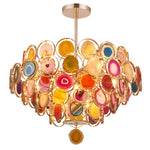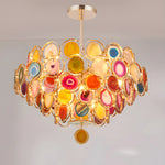 Bring vibrant elegance into your home with the Boho Luxe Rainbow Agate Chandelier. Featuring handcrafted natural agate slices in dazzling colors, this statement piece blends artistic charm with luxurious gold framing. The warm, diffused glow and striking palette make it a perfect centerpiece for bohemian, eclectic, or upscale interiors. Ideal for living rooms, dining spaces, or creative studios.
